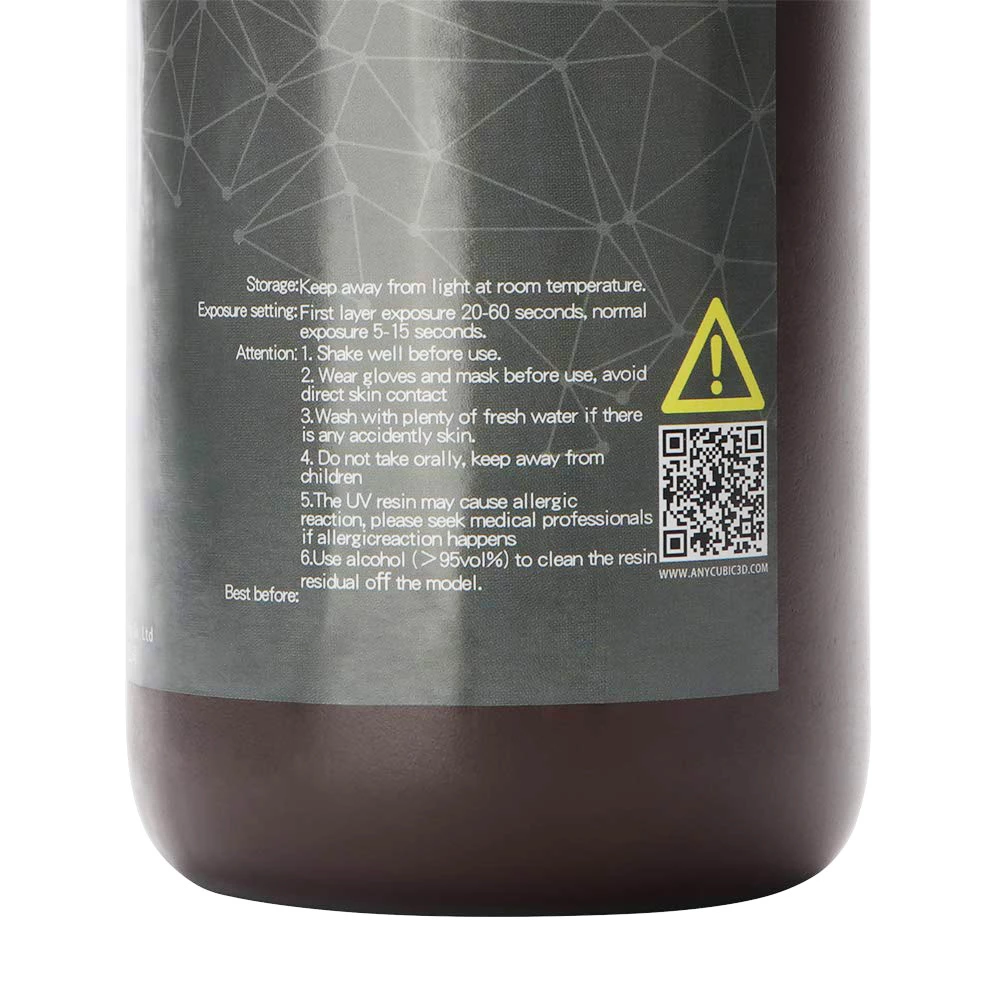 Fast curing & Exposure Time: Optimized curing time for Anycubic Photon, offering better printing quality. Bottom layer exposure: 50-60s; Normal exposure: 8-10s