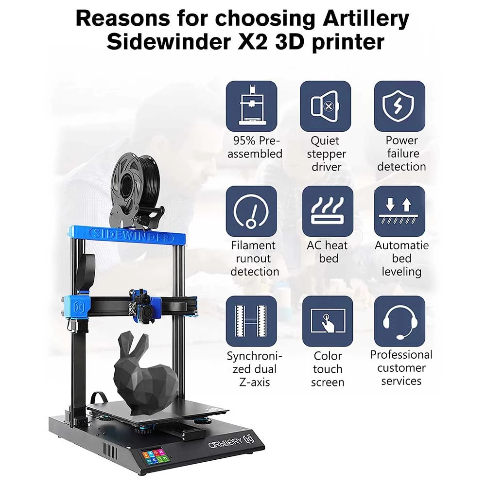| General | Brand:Â Artillery Type: 3DÂ printer Model:Â Sidewinder X2 Color: Black |