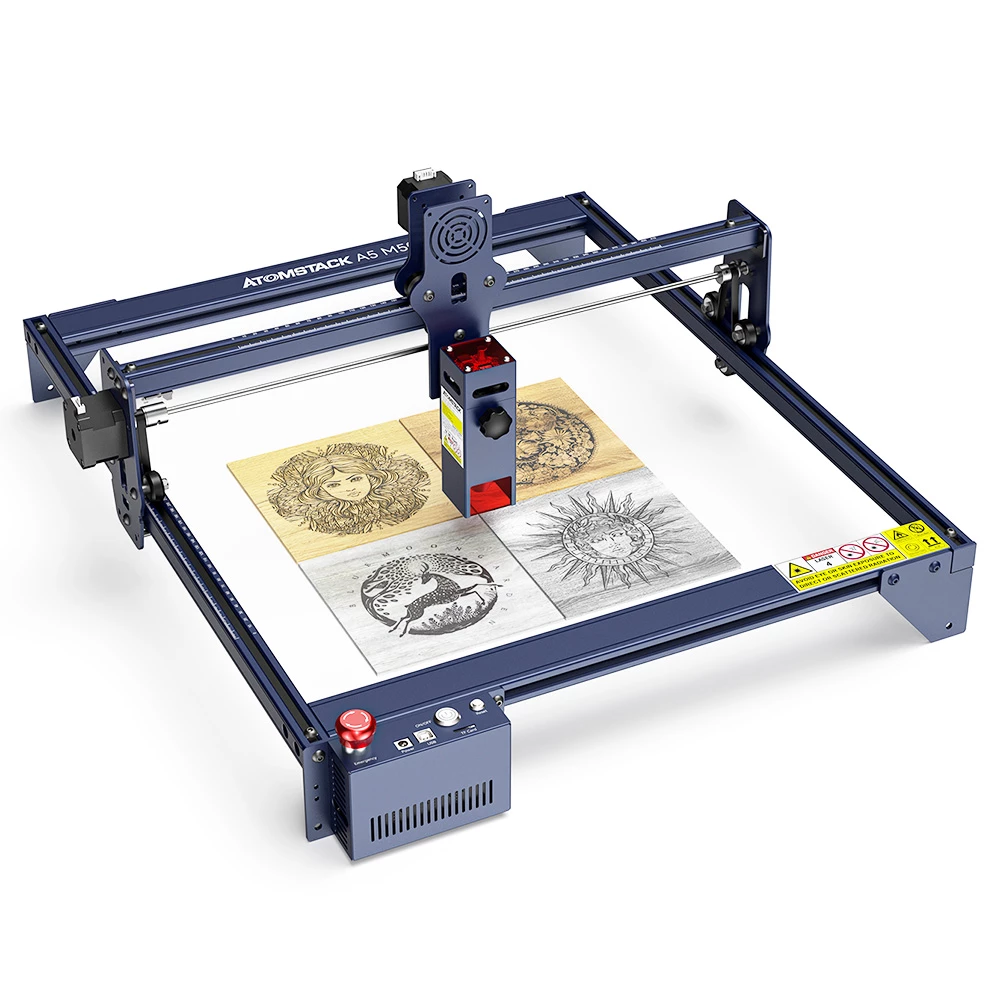 The A5 M50 laser cutter and engraver machine feature quadruple lens compression technology, 5-5.5W optical power, and fixed focus compressed spots. The spot is smaller and the energy is more concentrated, which can create more refined engraving products. The laser can easily cut 15mm thick wood and 15mm black acrylic; it can directly engrave mirror stainless steel metal and ceramics and can achieve the effect of a 100W COâ‚‚ laser engraving machine.