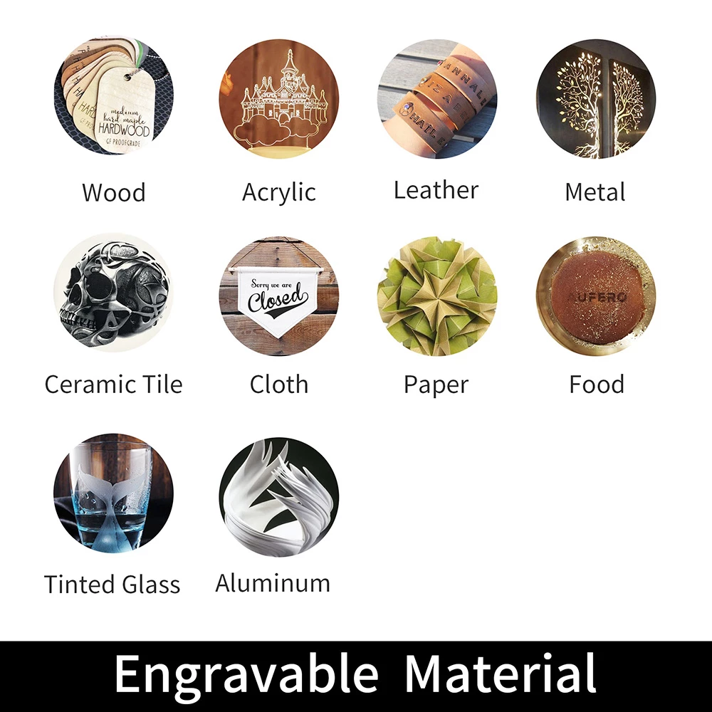 Aufero Laser engraver features a protective cover which effecitvely protects your eyes from dazzling beam; comes with a pair of goggles for more protection; works on food, MDF, paperboard, plywood, black acrylic, leather, power coated metal, stone, etc