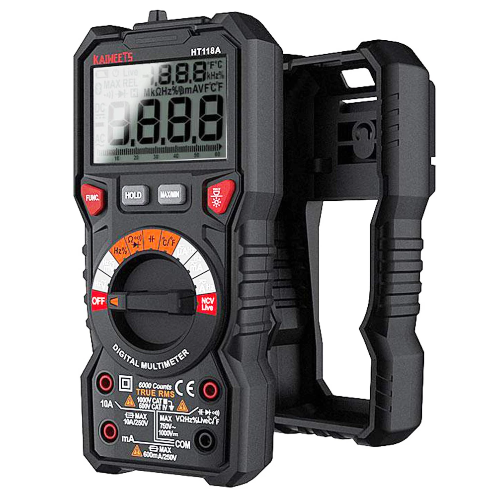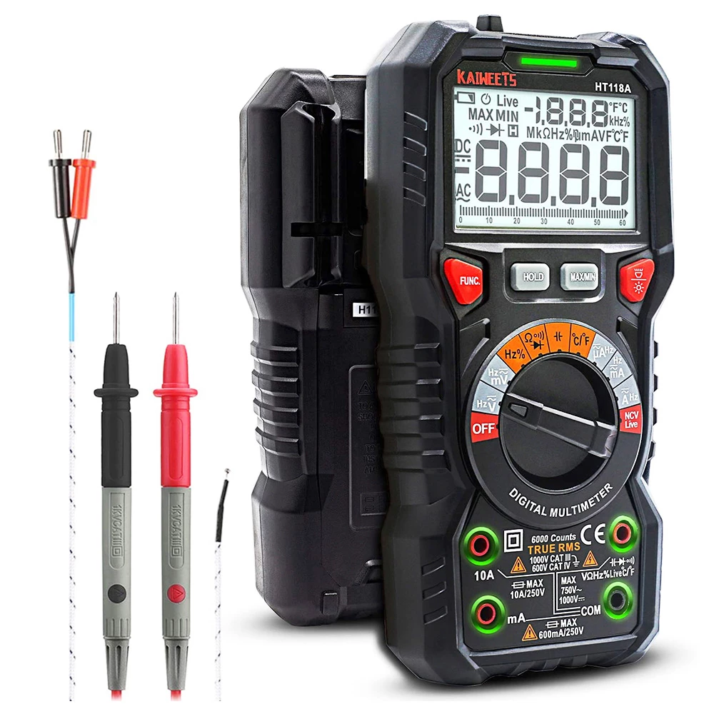 WIDE APPLICATIONS – KAIWEETS digital multimeter features 6000 counts auto-ranging for accurate measurement of AC/DC voltage, AC/DC current(DC is the default), resistance, continuity, frequency, capacitance and diode, liquid temperature, wire on-off, Battery checking. This advanced tester can diagnose automotive, industrial and household electrical issues.