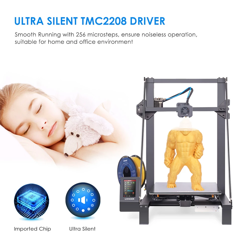 The LK5 PRO is integrated with 3kits of TMC2208 chipsets for X / Y / Z axis for quiet printing, of which will be reduced less nosie from motor. Developed with open sources mainboard for LK5 PRO, it will be easier for you to add an optional spare parts onto the 3d printer, such as BLTouch for auto levelling or upgrade with Marlin 2.X version for beta test.