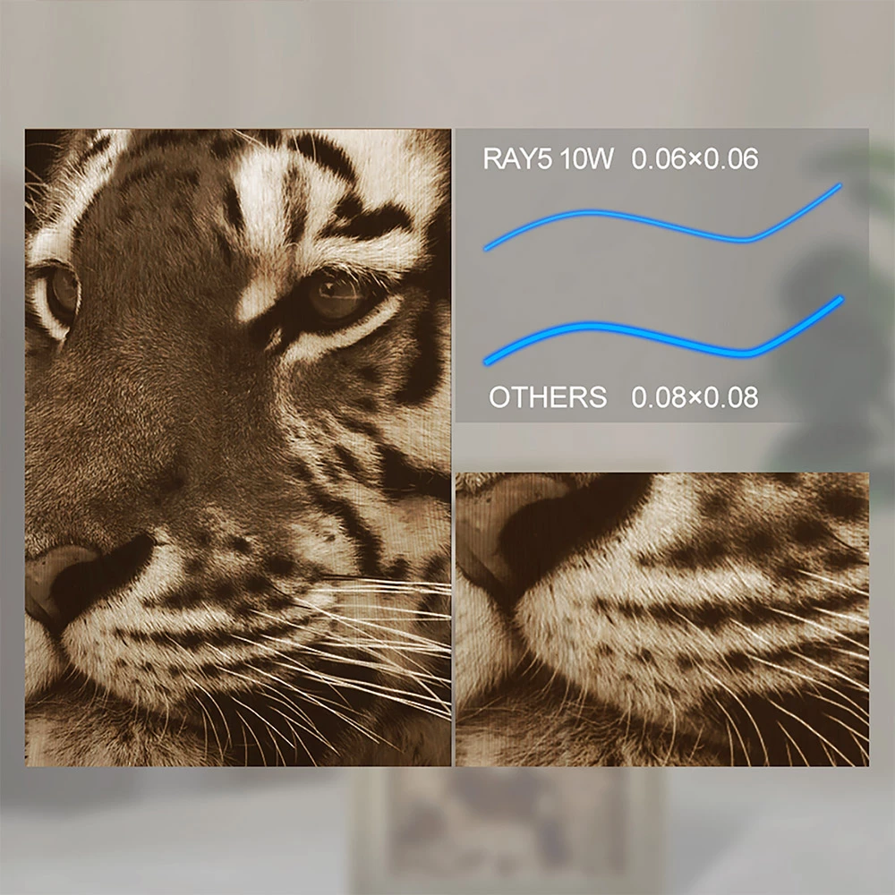 0.06 square millimeter ultra-fine laser spot is 2 times thinner than ordinary lasers, making RAY5’s cutting and engraving more precise and with fewer burn marks.