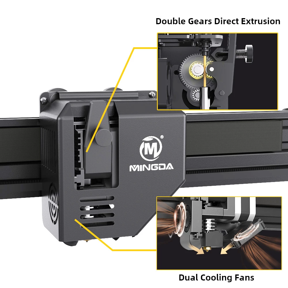 The printing head adopts a double fan two-way heat dissipation system, which cools down models rapidly. The printing speed is faster which can reach 100mm/s.