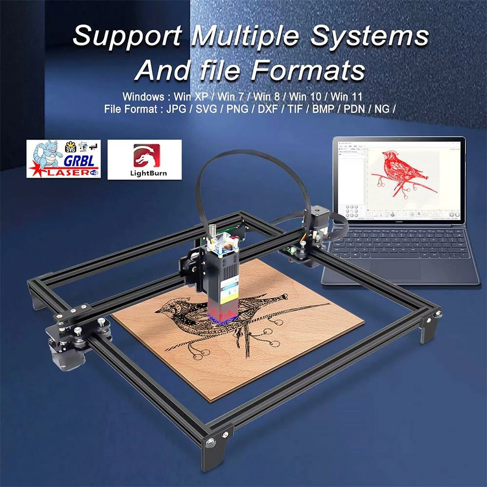 This machine is compatible with a variety of mature engraving software, such as LaserGRBL, and LightBurn, which supports Win XP/Win 7/Win 8/XP/Win 10, also supports MAC system (LightBurn), the engraving file format supports NC, BMP, JPG, PNG, DXF, etc.