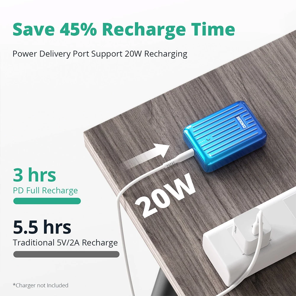 20W Quick Charge &Power Delivery: 20W PD input/ output USB-C port allows the portable phone charger to charge iPhone 13-8 to 50% only 30 minutes. Charging faster than the ordinary power supply. The USB-A port has exclusive ZEN+2.0 technology that supports almost all quick charge 3.0 compatible devices, take easy to power your devices.