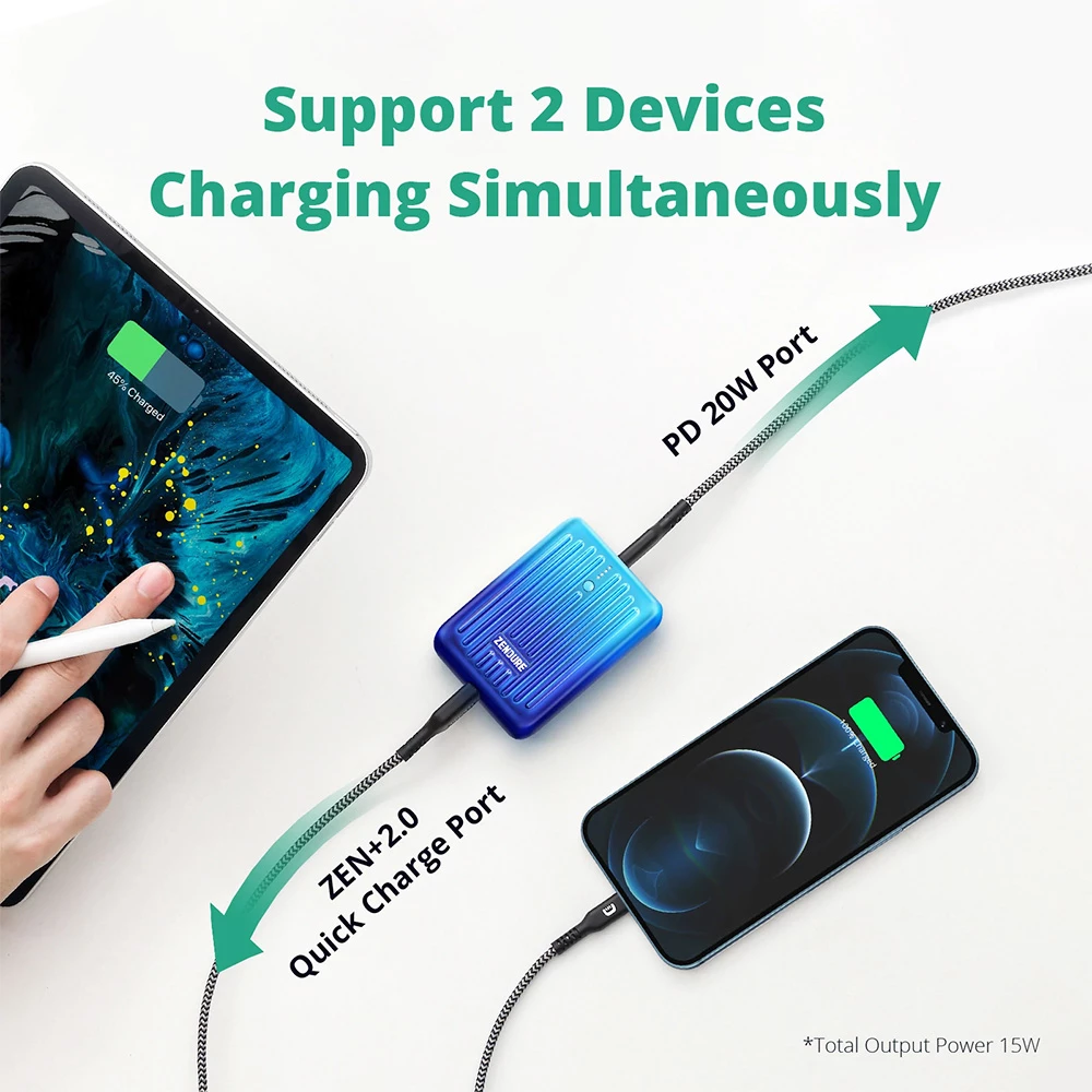 20W Quick Charge &Power Delivery: 20W PD input/ output USB-C port allows the portable phone charger to charge iPhone 13-8 to 50% only 30 minutes. Charging faster than the ordinary power supply. The USB-A port has exclusive ZEN+2.0 technology that supports almost all quick charge 3.0 compatible devices, take easy to power your devices.