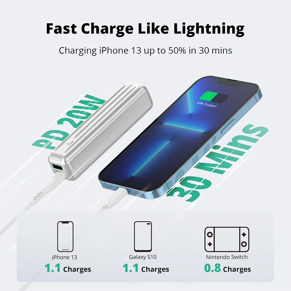 The portable charger can simply provide 1-2 times mobile power for smartphones, with 5,000mAh capacity. For iPhone 13, it can charge 1.1 times and it can recharge iPhone 12 1.3 times, iPhone SE 2020 1.5times, Galaxy S10 1.1times.