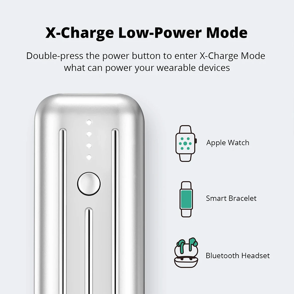 Power your wearable devices with X-Charge mode which double-press the power button to enter. The battery pack is widely compatible with the latest devices, such as iPhone, Galaxy, OnePlus, and Switch products, Cameras, Tablets, Game Consoles, e-Readers, and more.